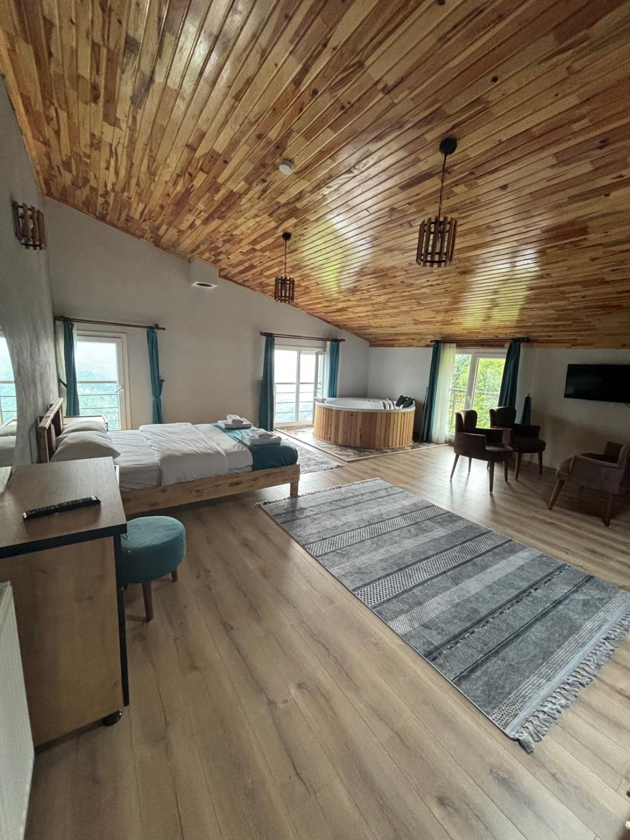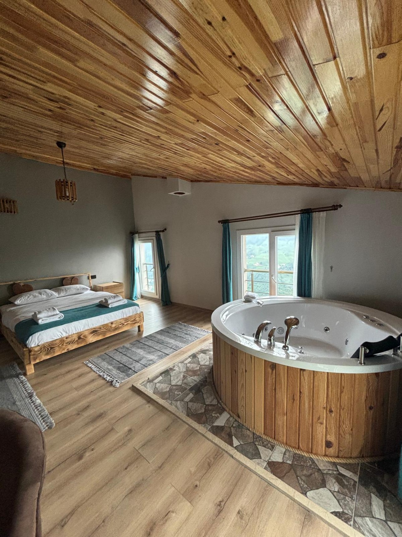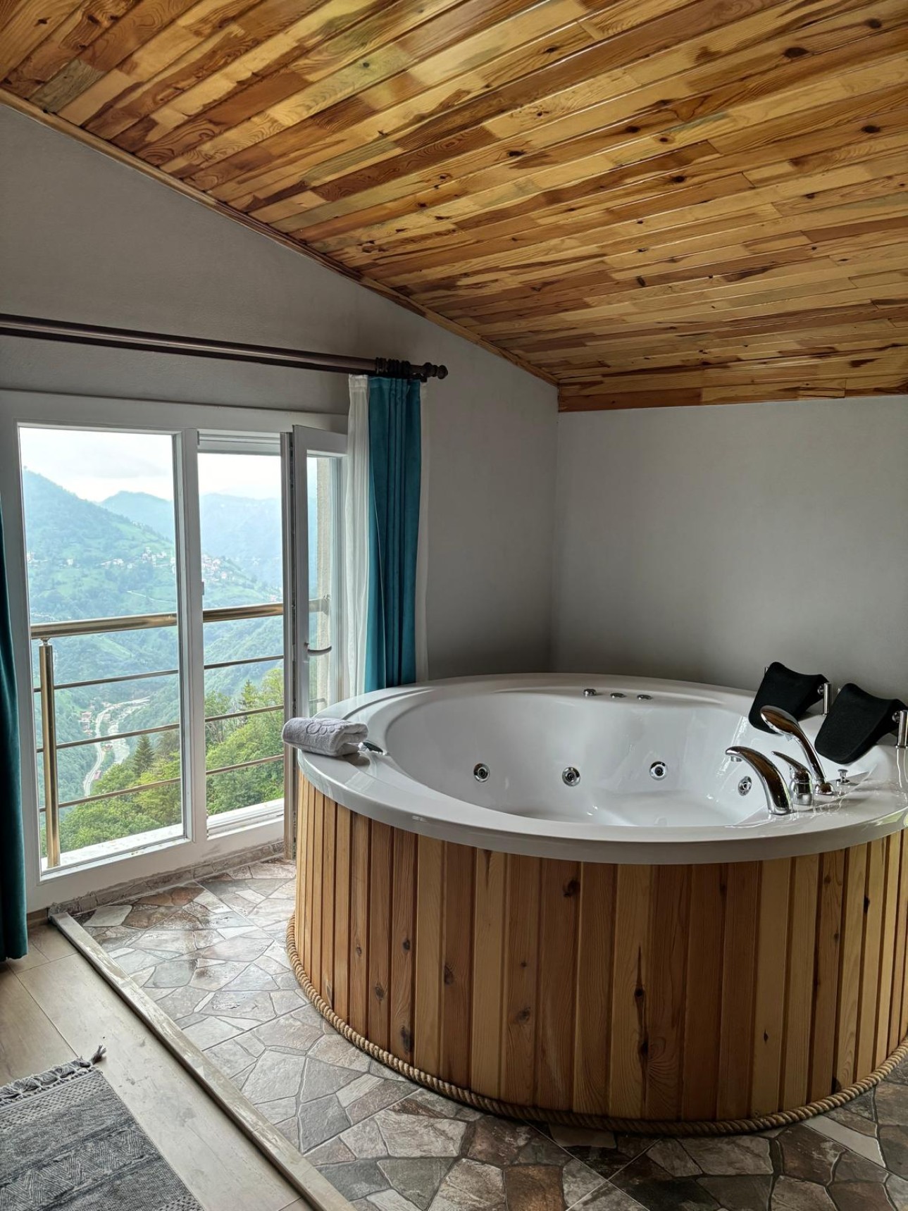 - odada bulunan jakuzi manzaraya karşı konumlanmıştır. Eşsiz orman, vadi ve şehir manzarası eşliğinde jakuzi keyfi yapabilirsiniz. Bunun haricinde ısınma ve soğutma sistemleri, televizyon, banyo malzameleri verilmektedir.