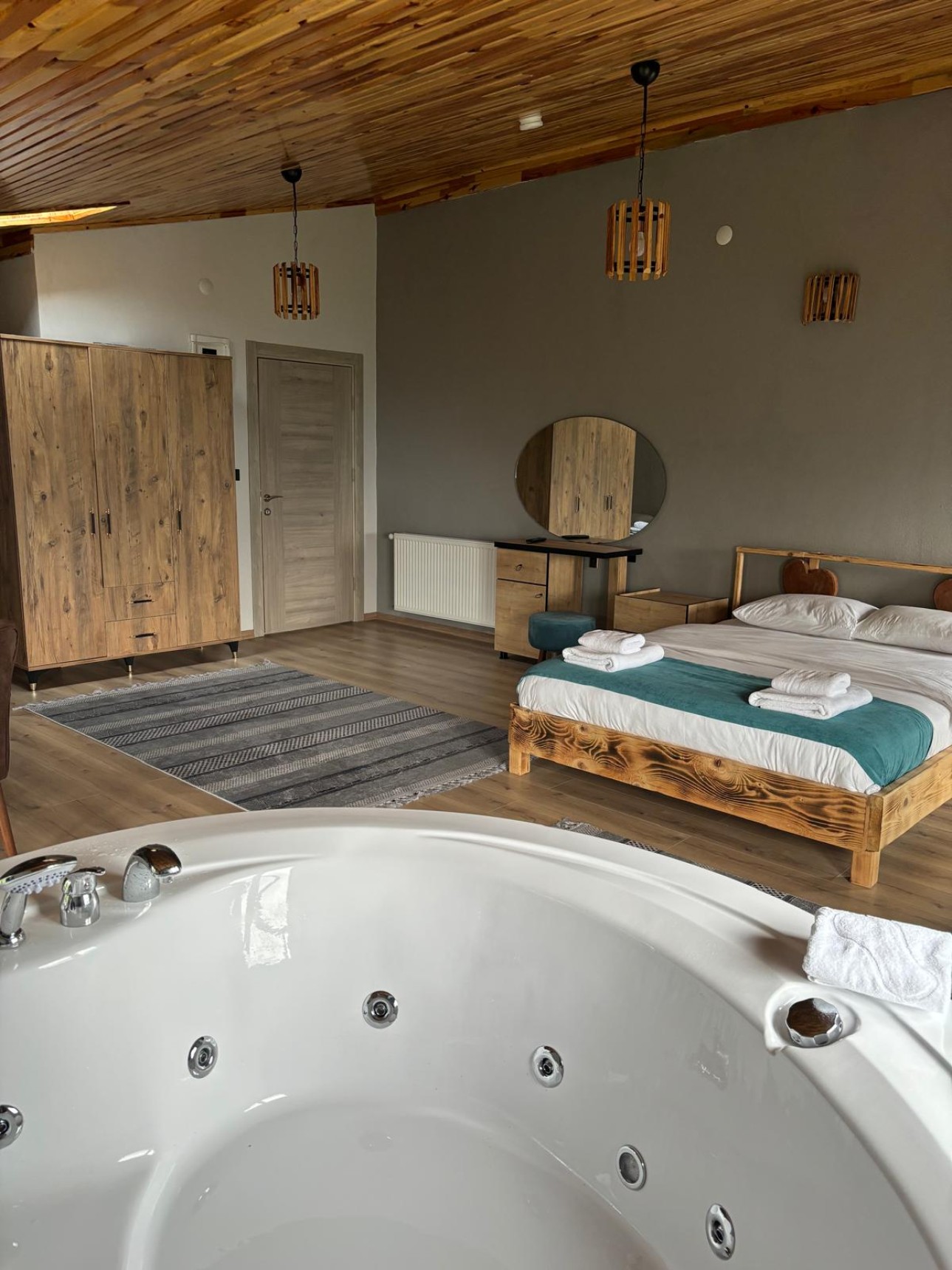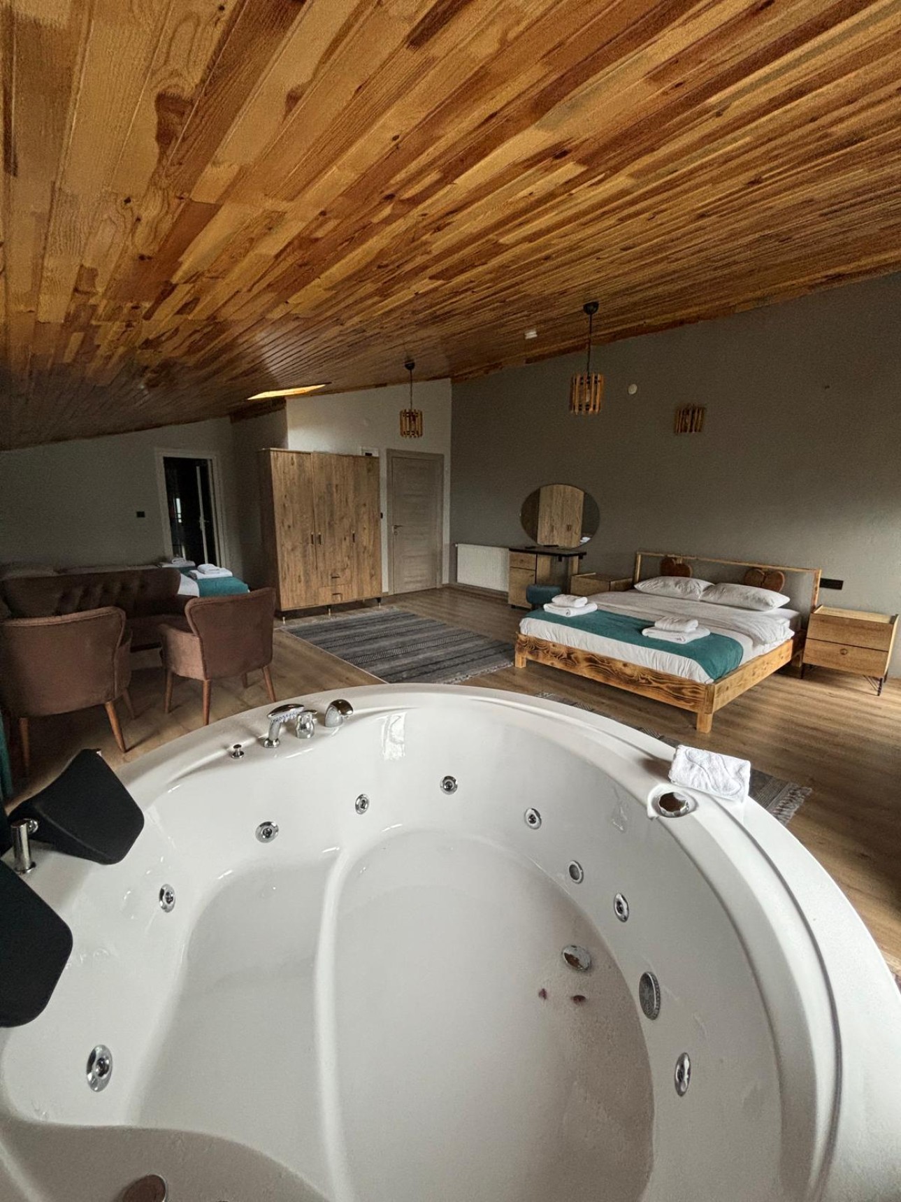 - odada bulunan jakuzi manzaraya karşı konumlanmıştır. Eşsiz orman, vadi ve şehir manzarası eşliğinde jakuzi keyfi yapabilirsiniz. Bunun haricinde ısınma ve soğutma sistemleri, televizyon, banyo malzameleri verilmektedir.